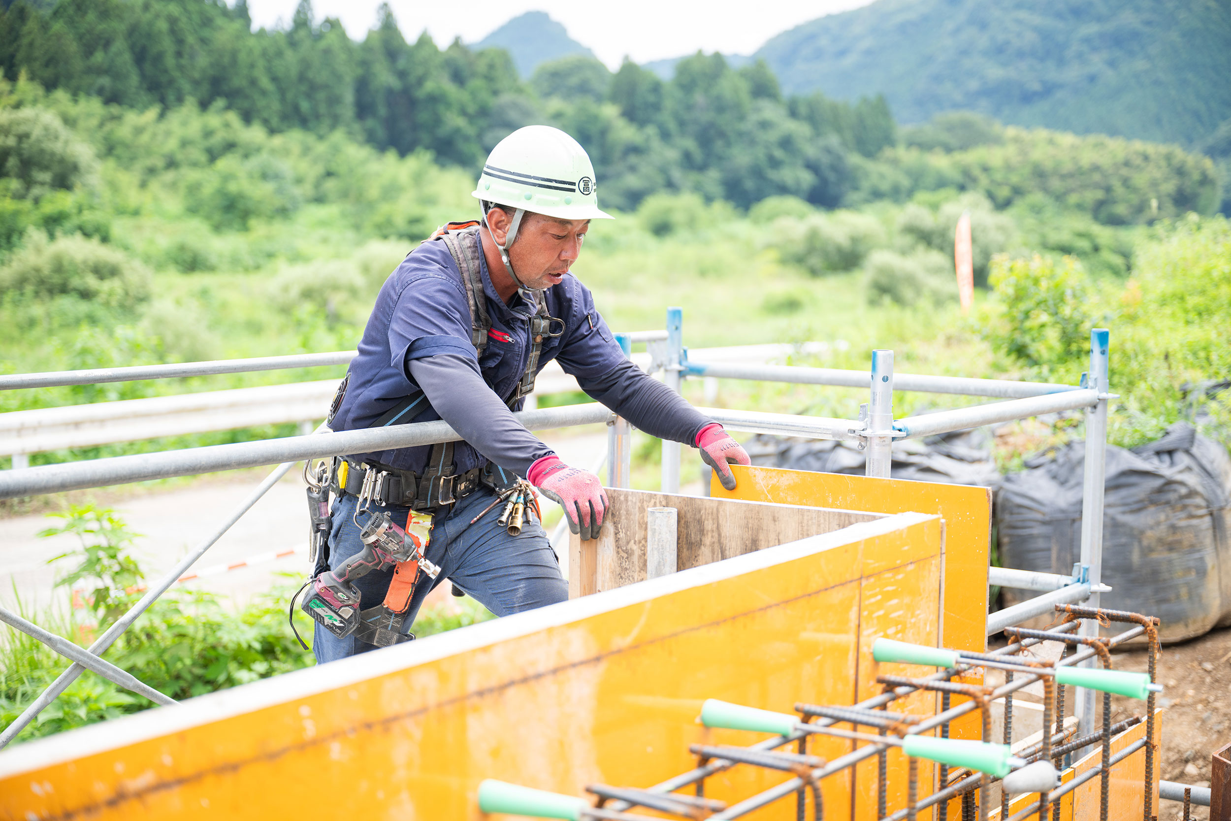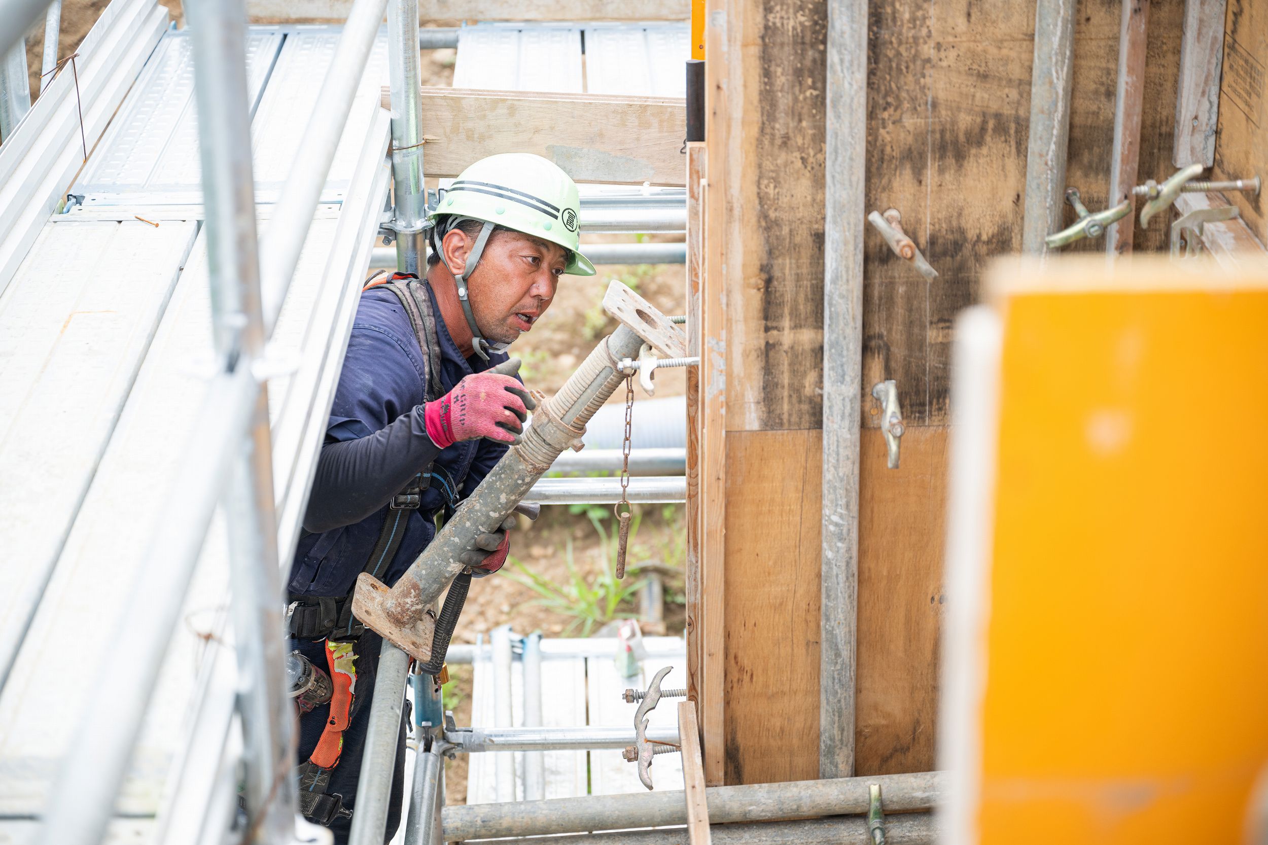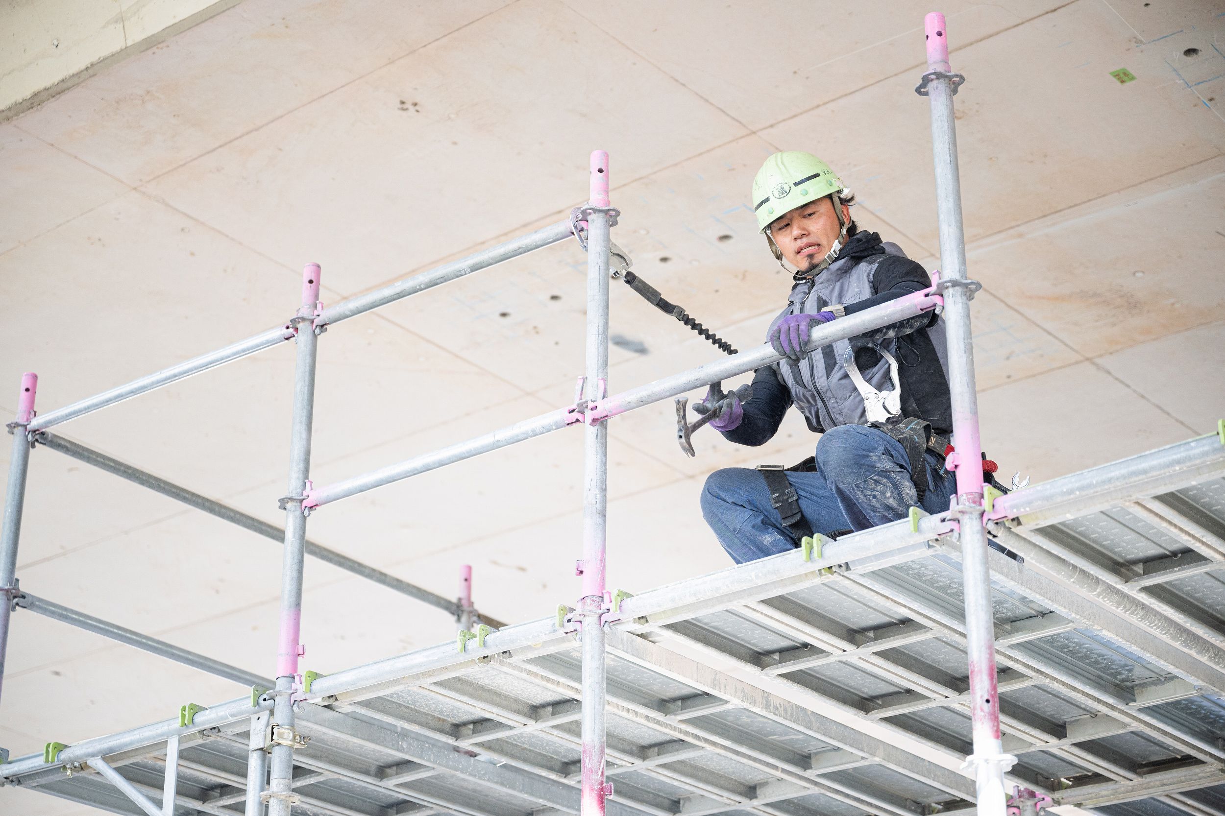 高所での作業を安全に行うために足場を組み立てていきます。
