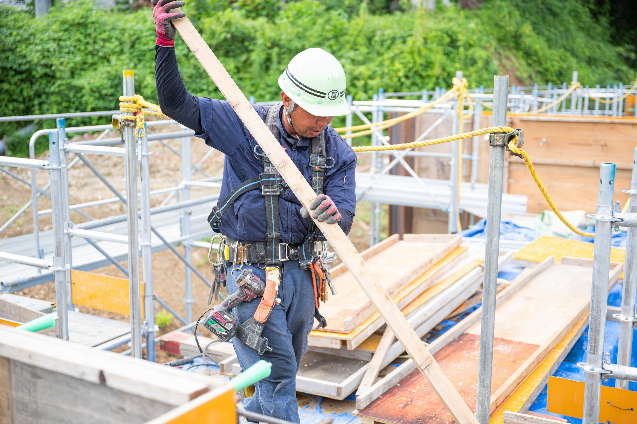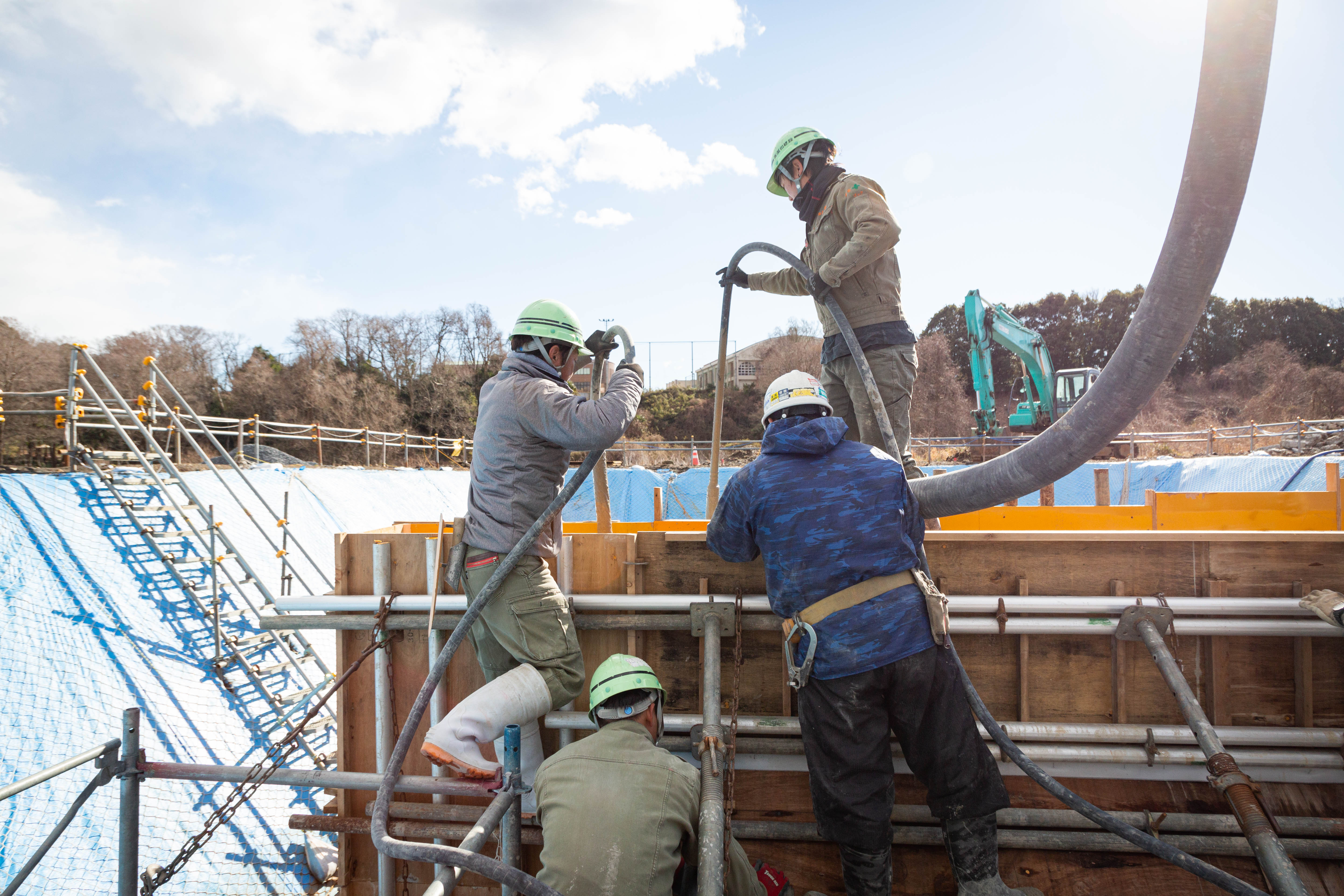 冨田建設では、型枠だけでなく、建物を建てる前の整地や、高所作業をするための足場、コンクリートの処理まで一連の作業を行っています。
