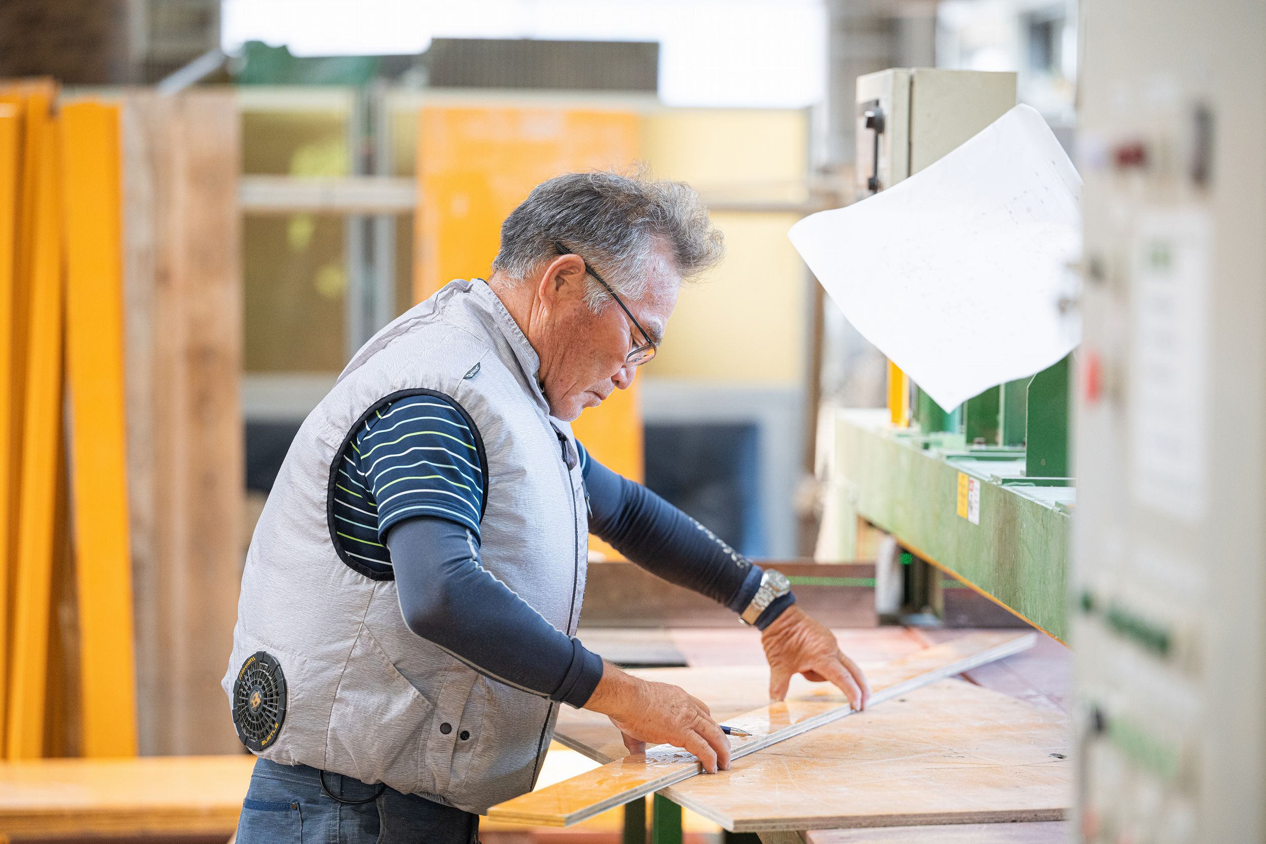加工図をもとに加工場で材料を裁断して機械や手作業で組み立て、